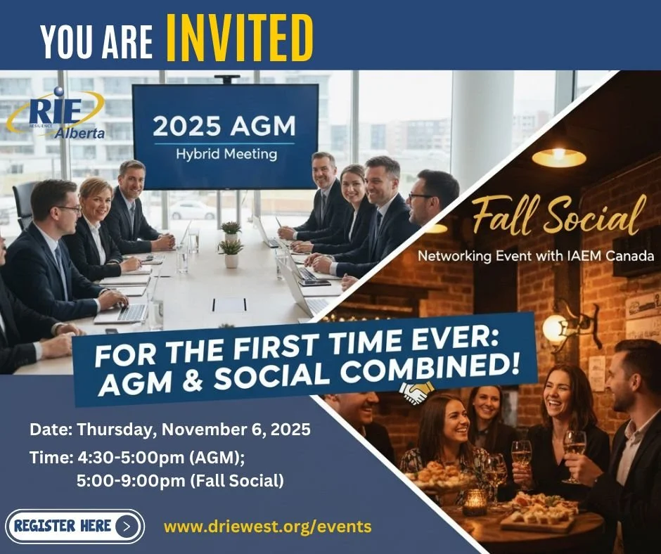 Please join Kim Cousineau, President of the RIE Alberta Chapter, and the Board of Directors for the hybrid RIE Alberta Annual General Meeting, followed by an in-person Fall Social event, hosted in collaboration with the International Association of Emergency Managers (IAEM).